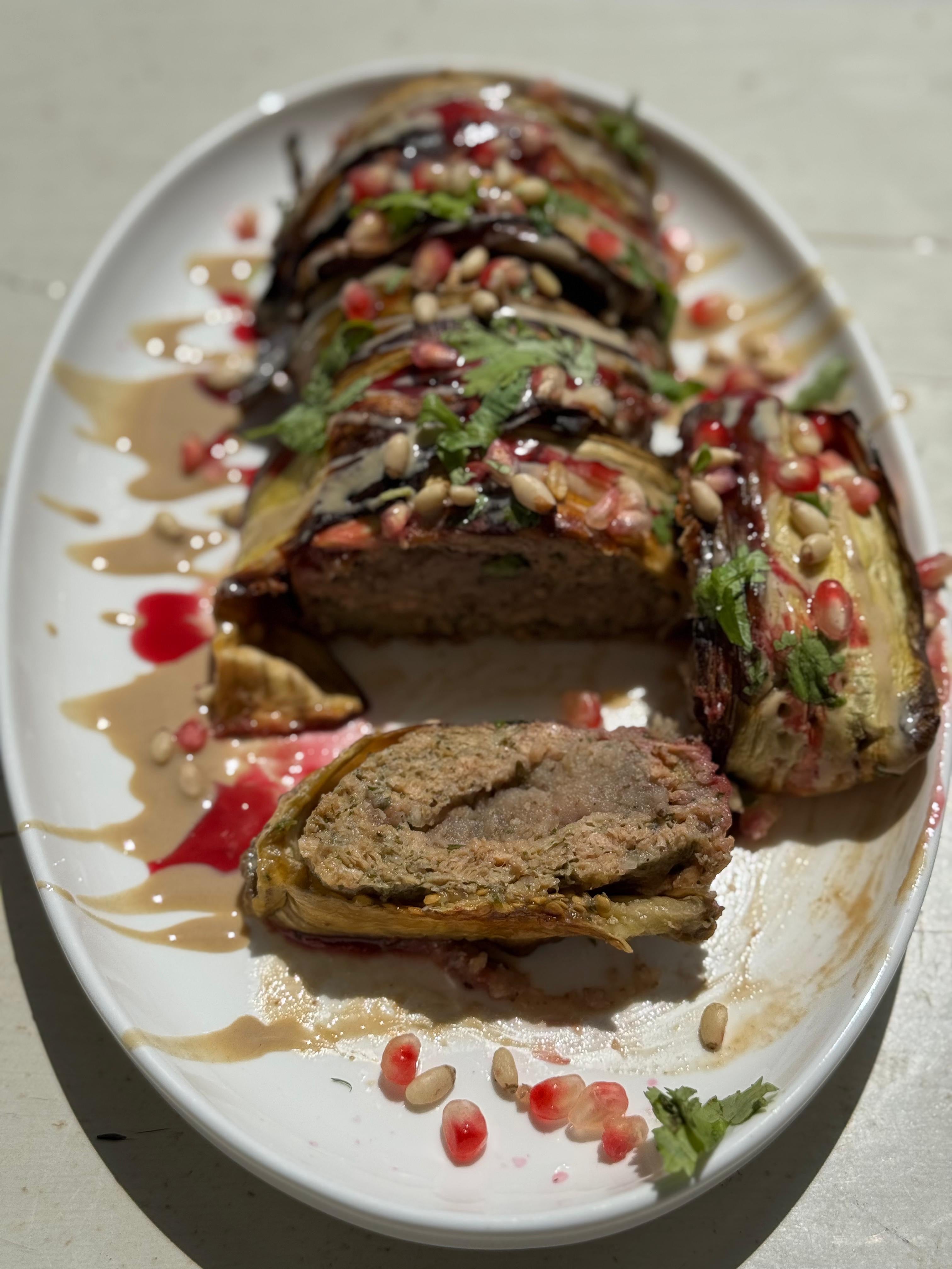 גלילת חצילים במילוי בשר טבעוני ופירה פטריות