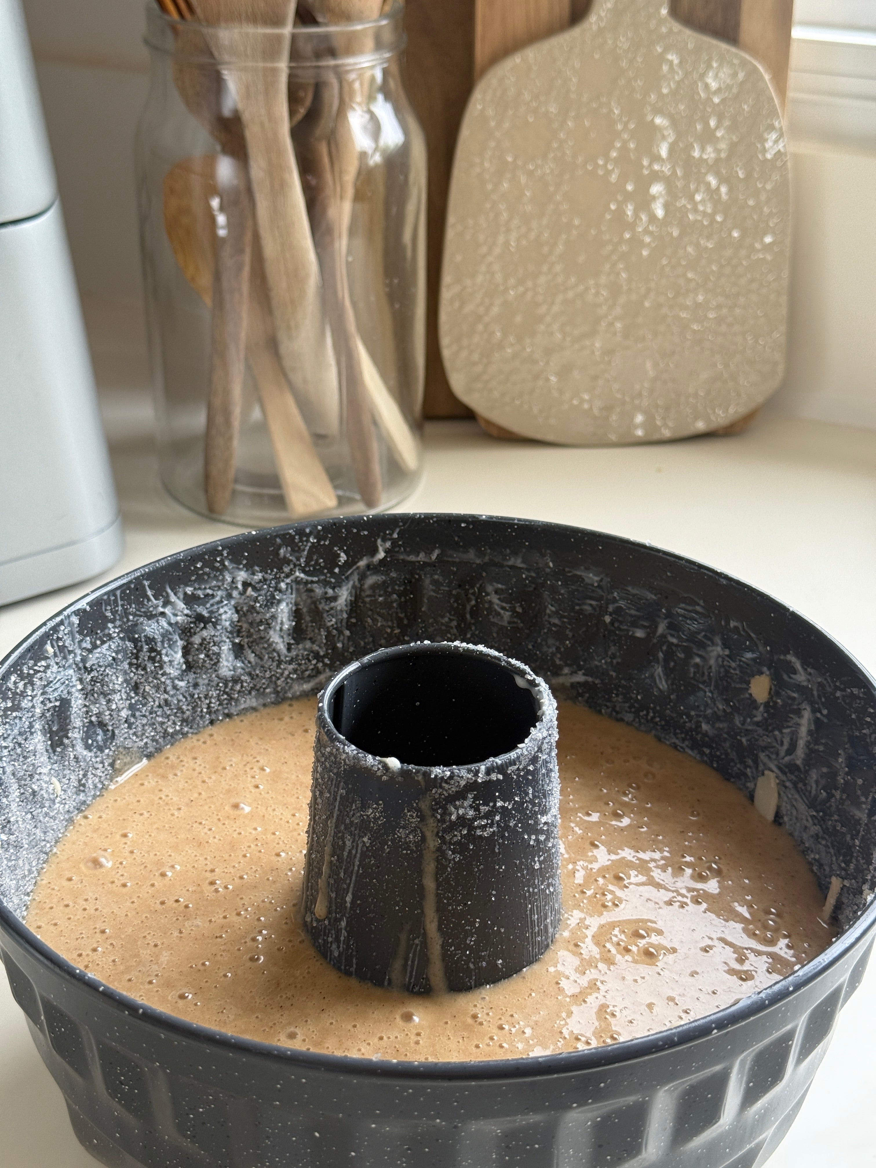 11. יוצקים את הבלילה לתבנית הקוגלהוף/אנג'ל שמרחנו ראש בנטורינה רכה וציפינו בשקדים פרוסים וסוכר/ לתבניות אינגליש מומפזרים מלמעלה שקדים פרוסים.